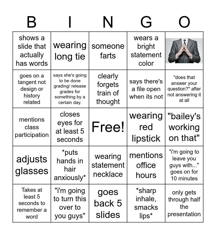 This bingo card has 1 images, a free space and 23 words: *puts hands in hair anxiously*, "i'm going to turn this over to you guys", clearly forgets train of thought, Takes at least 5 seconds to remember a word, shows a slide that actually has words, goes on a tangent not design or history related, wearing long tie, wearing red lipstick, wearing statement necklace, says there's a file open when its not, mentions class participation, mentions office hours, "i'm going to leave you guys with..." goes on for 10 minutes, says she's going to be done grading/ release grades for something by a certain day., *sharp inhale, smacks lips*, "bailey's working on that", someone farts, "does that answer your question?" after not answering it at all, closes eyes for at least 5 seconds, only gets through half the presentation, adjusts glasses, wears a bright statement color and goes back 5 slides.
