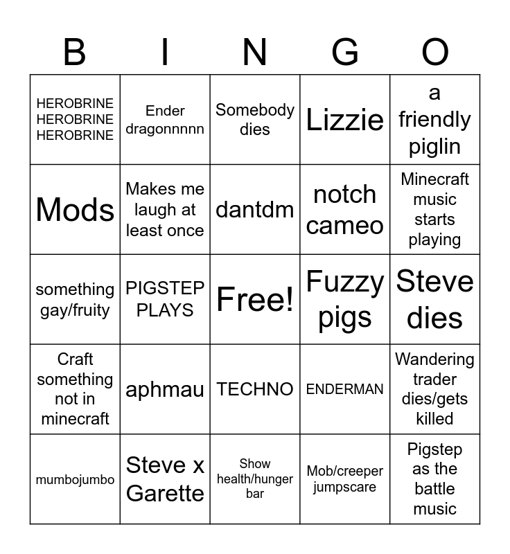 This bingo card has a free space and 24 words: aphmau, Steve x Garette, dantdm, mumbojumbo, a friendly piglin, HEROBRINE HEROBRINE HEROBRINE, Mods, Ender dragonnnnn, Fuzzy pigs, TECHNO, notch cameo, something gay/fruity, ENDERMAN, Wandering trader dies/gets killed, Makes me laugh at least once, Mob/creeper jumpscare, Steve dies, Somebody dies, Minecraft music starts playing, PIGSTEP PLAYS, Pigstep as the battle music, Craft something not in minecraft, Lizzie and Show health/hunger bar.