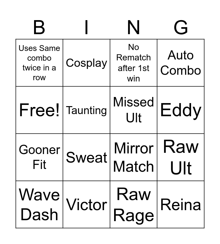 This bingo card has 16 words: Victor, Raw Ult, No Rematch after 1st win, Uses Same combo twice in a row, Gooner Fit, Cosplay, Mirror Match, Raw Rage, Free!, Taunting, Wave Dash, Auto Combo, Sweat, Eddy, Missed Ult and Reina.
