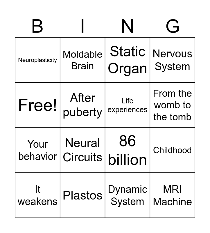 This bingo card has 16 words: Plastos, Childhood, Static Organ, Neuroplasticity, Your behavior, Moldable Brain, 86 billion, Dynamic System, Free!, After puberty, It weakens, Nervous System, Neural Circuits, From the womb to the tomb, Life experiences and MRI Machine.