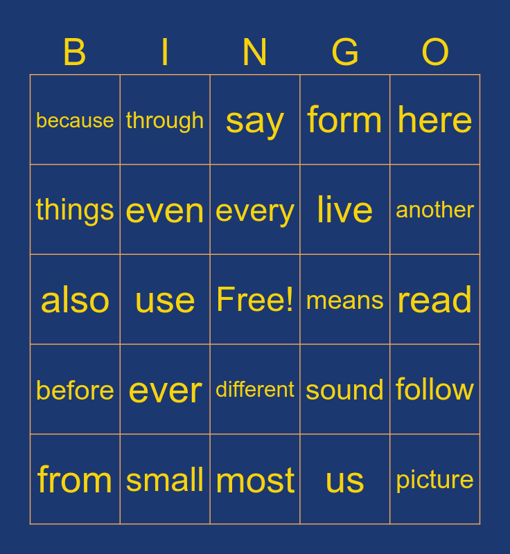 This bingo card has a free space and 27 words: sound, only, live, most, things, say, through, before, means, follow, also, form, from, small, another, large, even, every, ever, because, read, us, use, picture, different, here and her.