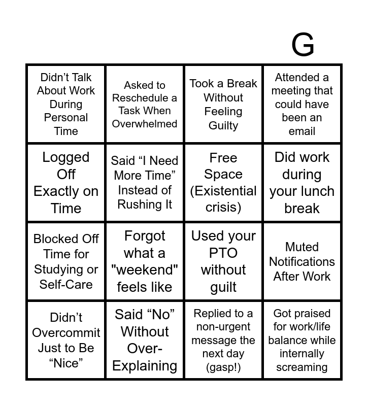 This bingo card has 16 words: Said “No” Without Over-Explaining, Muted Notifications After Work, Took a Break Without Feeling Guilty, Didn’t Talk About Work During Personal Time, Blocked Off Time for Studying or Self-Care, Asked to Reschedule a Task When Overwhelmed, Used your PTO without guilt, Replied to a non-urgent message the next day (gasp!), Logged Off Exactly on Time, Said “I Need More Time” Instead of Rushing It, Didn’t Overcommit Just to Be “Nice”, Attended a meeting that could have been an email, Forgot what a "weekend" feels like, Did work during your lunch break, Free Space (Existential crisis) and Got praised for work/life balance while internally screaming.