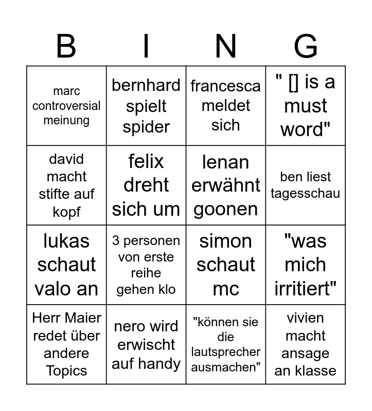 This bingo card has 16 words: nero wird erwischt auf handy, "was mich irritiert", francesca meldet sich, marc controversial meinung, lukas schaut valo an, bernhard spielt spider, simon schaut mc, "können sie die lautsprecher ausmachen", david macht stifte auf kopf, felix dreht sich um, Herr Maier redet über andere Topics, " [] is a must word", 3 personen von erste reihe gehen klo, ben liest tagesschau, lenan erwähnt goonen and vivien macht ansage an klasse.