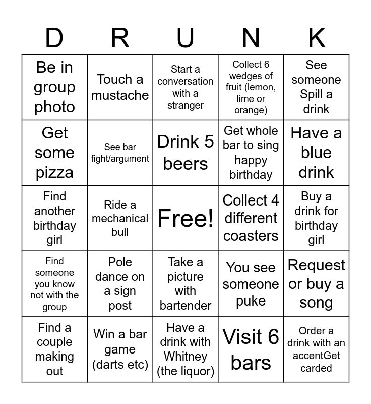 This bingo card has a free space and 26 words: Take a picture with bartender, Visit 6 bars, Drink 5 beers, Win a bar game (darts etc), See someone Spill a drink, Be in group photo, Get some pizza, Touch a mustache, Buy a drink for birthday girl, You see someone puke, Get whole bar to sing happy birthday, Find another birthday girl, Request or buy a song, Find a couple making out, Ride a mechanical bull, Take a shot with no hands, Collect 6 wedges of fruit (lemon, lime or orange), Find someone you know not with the group, Start a conversation with a stranger, Order a drink with an accentGet carded, Have a blue drink, Have a drink with Whitney (the liquor), Collect 4 different coasters, Pole dance on a sign post, See bar fight/argument and See someone sleeping/passed out.