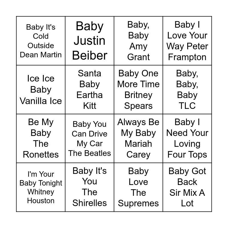This bingo card has 16 words: Baby It's You The Shirelles, Baby I Need Your Loving Four Tops, Baby, Baby Amy Grant, Baby It's Cold Outside Dean Martin, Be My Baby The Ronettes, Baby Justin Beiber, Always Be My Baby Mariah Carey, Baby Love The Supremes, Ice Ice Baby Vanilla Ice, Santa Baby Eartha Kitt, I'm Your Baby Tonight Whitney Houston, Baby I Love Your Way Peter Frampton, Baby You Can Drive My Car The Beatles, Baby, Baby, Baby TLC, Baby One More Time Britney Spears and Baby Got Back Sir Mix A Lot.