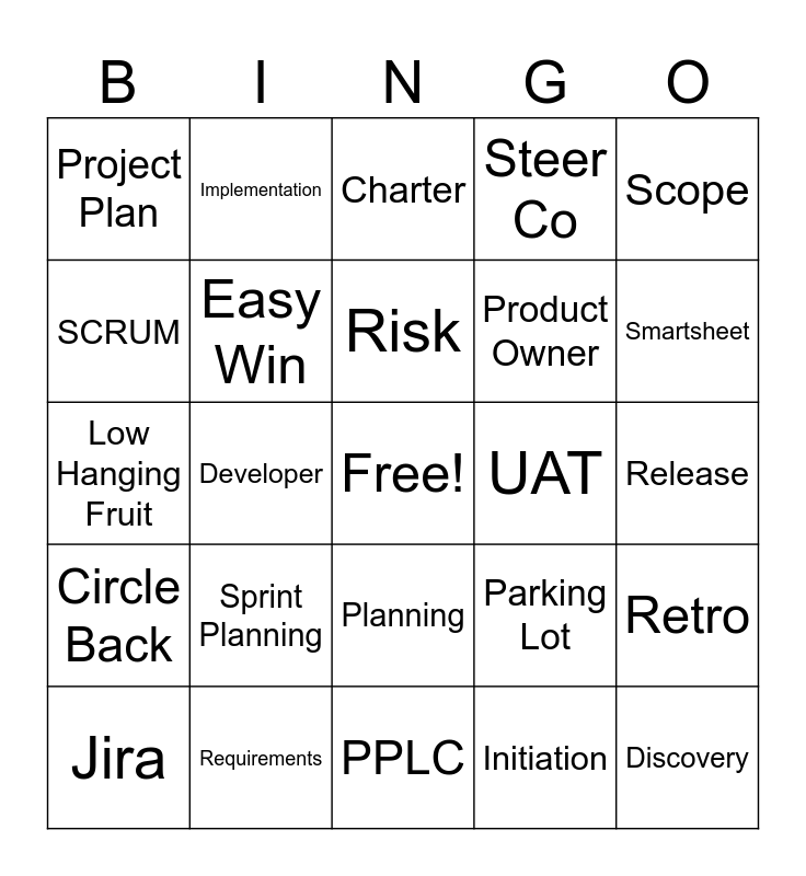 This bingo card has a free space and 24 words: Sprint Planning, Requirements, Risk, Jira, Scope, Project Plan, SCRUM, Implementation, UAT, Planning, Product Owner, Low Hanging Fruit, Parking Lot, Retro, Easy Win, Initiation, Release, Charter, Smartsheet, Developer, Discovery, Circle Back, Steer Co and PPLC.