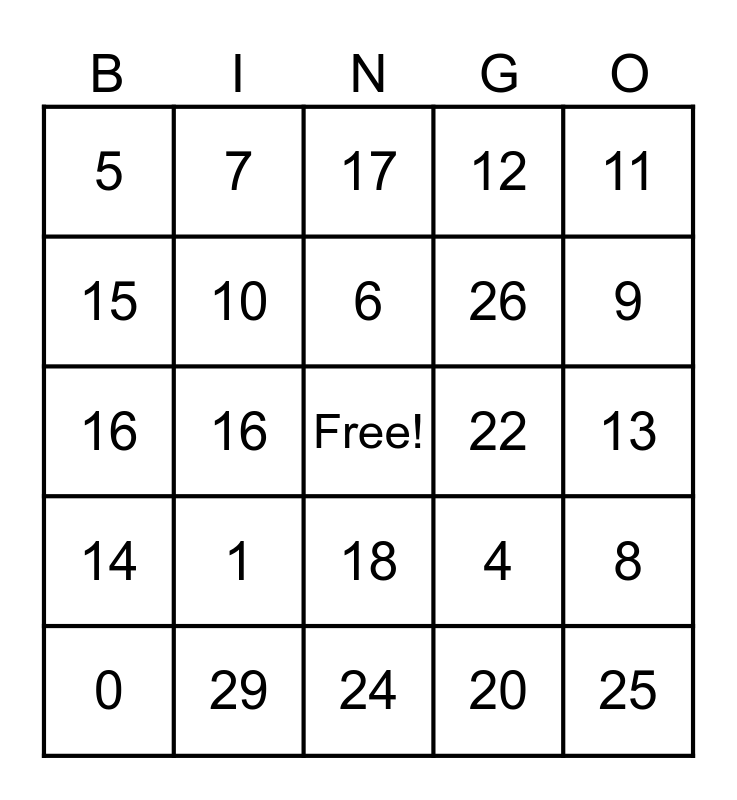 This bingo card has a free space and 24 words: 0, 1, 6, 20, 11, 5, 7, 17, 22, 13, 16, 10, 4, 8, 15, 29, 24, 12, 9, 14, 16, 18, 26 and 25.