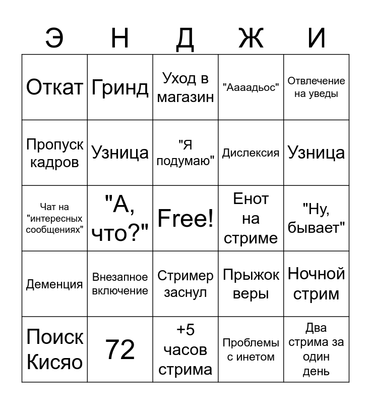 This bingo card has a free space and 24 words: Внезапное включение, 72, "Я подумаю", Поиск Кисяо, Отвлечение на уведы, Откат, Пропуск кадров, Гринд, Енот на стриме, Стример заснул, Дислексия, Чат на "интересных сообщениях", Прыжок веры, Ночной стрим, Узница, Проблемы с инетом, "Ну, бывает", Уход в магазин, Узница, "А, что?", Два стрима за один день, Деменция, "Аааадьос" and +5 часов стрима.
