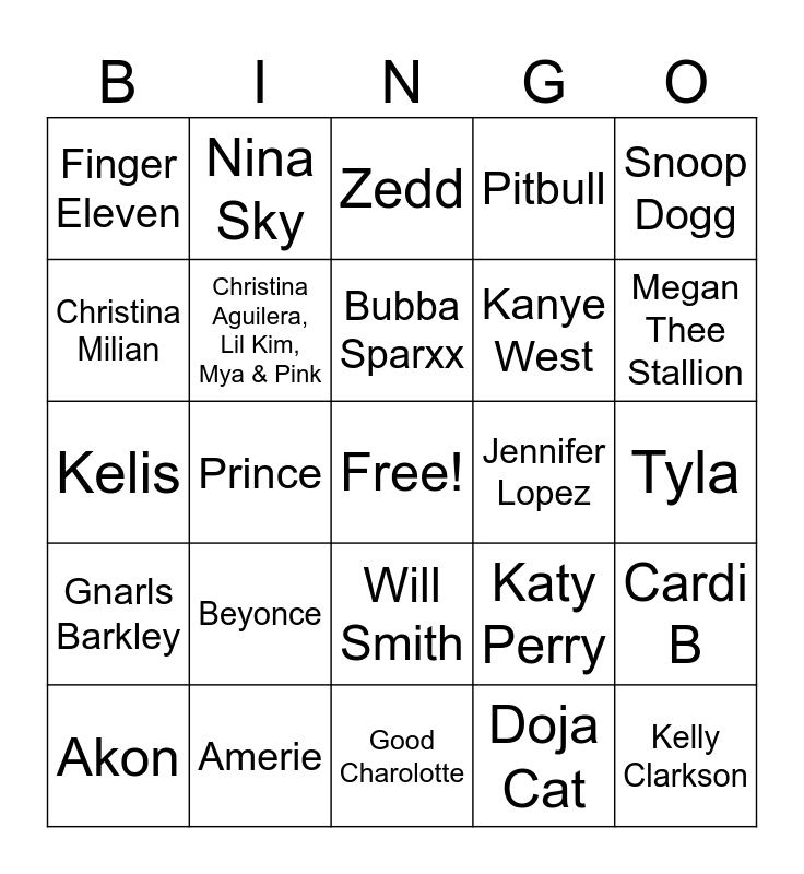 This bingo card has a free space and 29 words: Akon, Michael Jackson, Prince, Eminem, Finger Eleven, Zedd, Christina Aguilera, Lil Kim, Mya & Pink, Beyonce, Jennifer Lopez, Amerie, Tyla, Kelly Clarkson, Good Charolotte, Doja Cat, Megan Thee Stallion, Ciara, Will Smith, Gnarls Barkley, Snoop Dogg, Kelis, Katy Perry, Estelle, Kanye West, Christina Milian, Pitbull, Nina Sky, Cardi B, Bubba Sparxx and Missy Ellot.