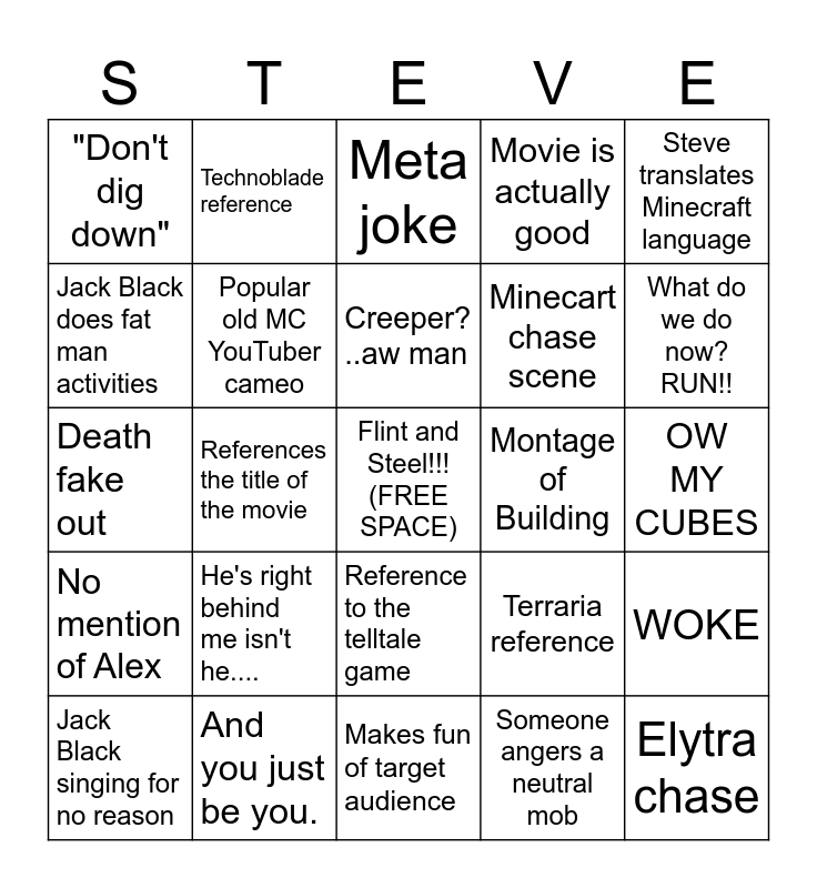 This bingo card has a free space and 24 words: He's right behind me isn't he...., And you just be you., Creeper? ..aw man, Jack Black singing for no reason, Steve translates Minecraft language, "Don't dig down", Jack Black does fat man activities, Technoblade reference, Montage of Building, Reference to the telltale game, Minecart chase scene, Death fake out, Terraria reference, WOKE, Popular old MC YouTuber cameo, Someone angers a neutral mob, OW MY CUBES, Meta joke, What do we do now? RUN!!, References the title of the movie, Elytra chase, No mention of Alex, Movie is actually good and Makes fun of target audience.