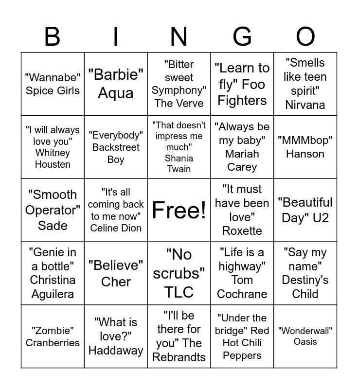This bingo card has a free space and 25 words: "Believe" Cher, "I'll be there for you" The Rebrandts, "That doesn't impress me much" Shania Twain, "Zombie" Cranberries, "Smells like teen spirit" Nirvana, "Wannabe" Spice Girls, "I will always love you" Whitney Housten, "Barbie" Aqua, "It must have been love" Roxette, "No scrubs" TLC, "Always be my baby" Mariah Carey, "Smooth Operator" Sade, "Life is a highway" Tom Cochrane, "Say my name" Destiny's Child, "Everybody" Backstreet Boy, "The fresh prince of Bell-Air" DJ Jazzy Jeff, "Beautiful Day" U2, "Bitter sweet Symphony" The Verve, "MMMbop" Hanson, "It's all coming back to me now" Celine Dion, "Wonderwall" Oasis, "What is love?" Haddaway, "Genie in a bottle" Christina Aguilera, "Learn to fly" Foo Fighters and "Under the bridge" Red Hot Chili Peppers.