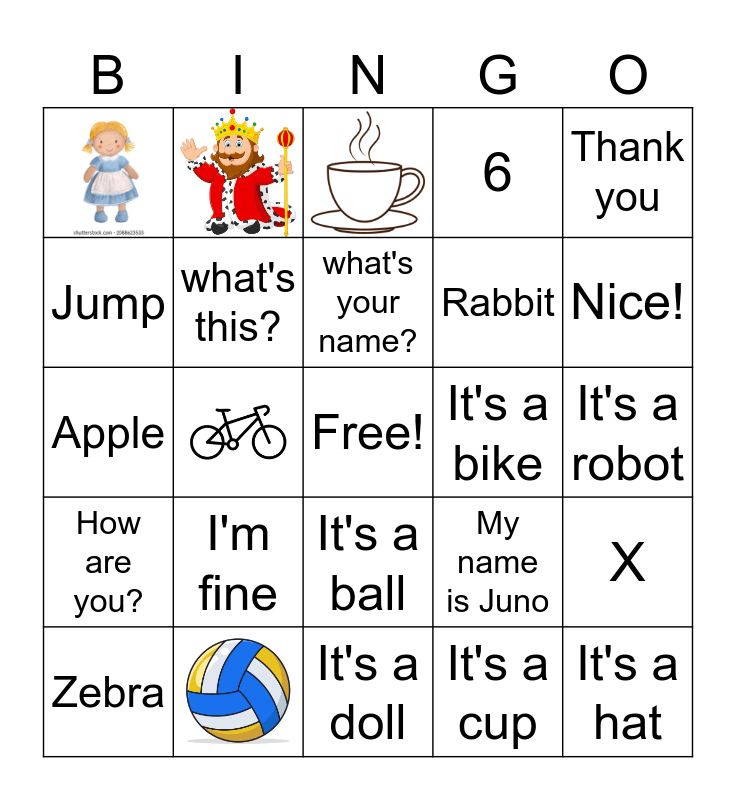 This bingo card has 7 images, a free space and 23 words: what's this?, It's a ball, It's a bike, It's a doll, It's a robot, It's a hat, It's a cup, Look!, Nice!, Hi, Tom, My name is Juno, How are you?, I'm fine, Thank you, Apple, Game, Rabbit, Jump, 6, X, Zebra, what's your name? and Bye.