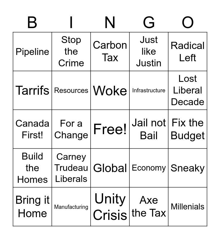 This bingo card has a free space and 24 words: Carney Trudeau Liberals, Manufacturing, Woke, Bring it Home, Radical Left, Pipeline, Tarrifs, Stop the Crime, Jail not Bail, Global, Infrastructure, Canada First!, Economy, Sneaky, Resources, Axe the Tax, Fix the Budget, Carbon Tax, Lost Liberal Decade, For a Change, Millenials, Build the Homes, Just like Justin and Unity Crisis.