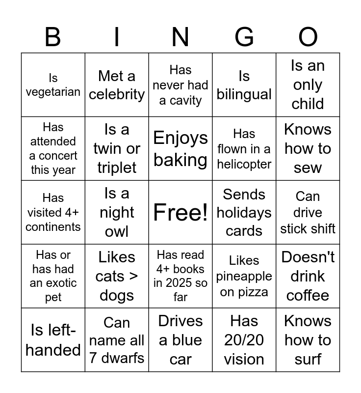 This bingo card has a free space and 24 words: Likes cats > dogs, Can name all 7 dwarfs, Enjoys baking, Is left-handed, Is an only child, Is vegetarian, Has attended a concert this year, Met a celebrity, Sends holidays cards, Has read 4+ books in 2025 so far, Has flown in a helicopter, Has visited 4+ continents, Likes pineapple on pizza, Doesn't drink coffee, Is a twin or triplet, Has 20/20 vision, Can drive stick shift, Has never had a cavity, Knows how to sew, Is a night owl, Knows how to surf, Has or has had an exotic pet, Is bilingual and Drives a blue car.