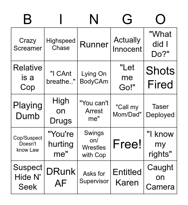 This bingo card has 25 words: "You're hurting me", Asks for Supervisor, Lying On BodyCAm, Suspect Hide N' Seek, "What did I Do?", Crazy Screamer, Relative is a Cop, Highspeed Chase, "Call my Mom/Dad", Swings on/ Wrestles with Cop, "Let me Go!", Playing Dumb, Free!, "I know my rights", "I CAnt breathe..", Caught on Camera, Taser Deployed, Runner, Shots Fired, High on Drugs, "You can't Arrest me", DRunk AF, Cop/Suspect Doesn't know Law, Actually Innocent and Entitled Karen.