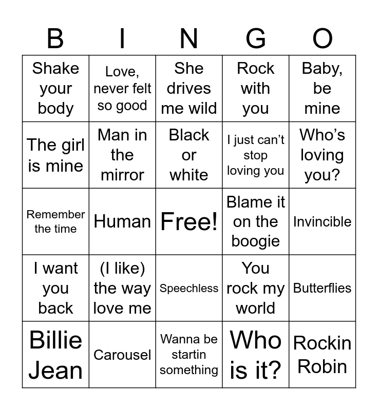 This bingo card has a free space and 55 words: Beat it, Billie Jean, Thriller, Shake your body, Wanna be startin something, The way you make me feel, Man in the mirror, Just good friends, I just can’t stop loving you, Liberian girl, Rock with you, Workin day and night, Off-the-wall, I can’t help it, Don’t stop till you get enough, Girlfriend, Baby, be mine, Human, P.Y.T., Rockin Robin, Blame it on the boogie, Heal the world, You rock my world, She drives me wild, Remember the time, Black or white, Who is it?, Keep the faith, Invincible, Butterflies, Bad, Dirty Diana, Hollywood tonight, This place hotel, The girl is mine, Remember the time, Say say say, I want you back, Heaven can wait, I can’t help it, Love, never felt so good, We are the world, Blood on the dance, 2 bad, (I like) the way love me, Carousel, Loving you, A place with no name, Streetwalker, Who’s loving you?, Fly away, Smooth criminal, Song groove, Speechless and she’s out of my life.