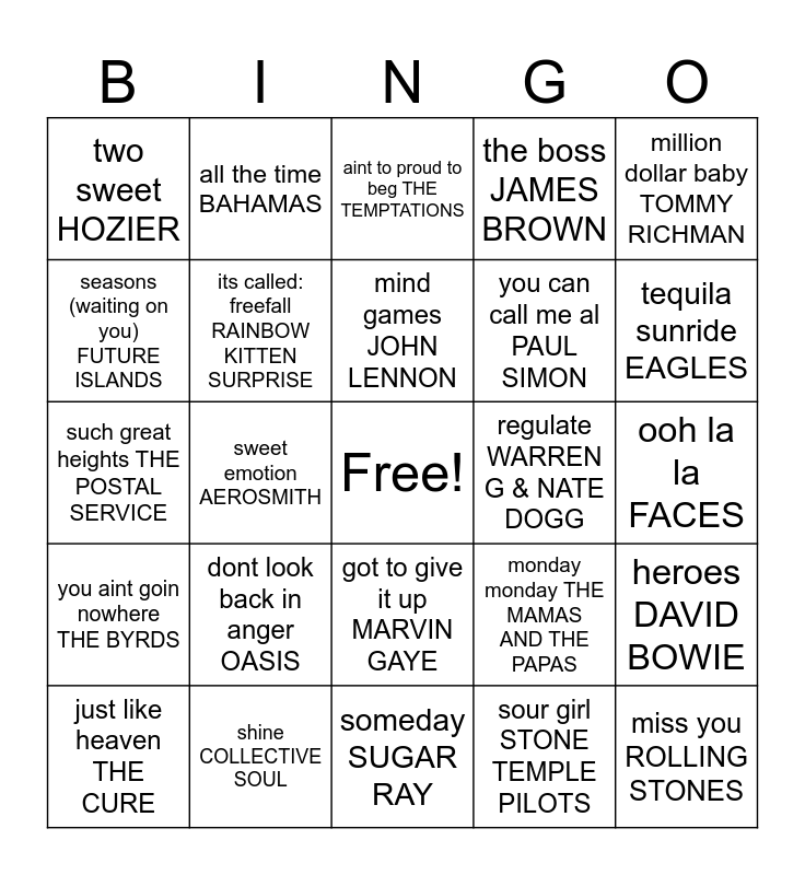 This bingo card has a free space and 42 words: always on the run LENNY KRAVITZ, mind games JOHN LENNON, because the night PATTI SMITH, dont look back in anger OASIS, sour girl STONE TEMPLE PILOTS, heroes DAVID BOWIE, miss you ROLLING STONES, how long ACE, aint to proud to beg THE TEMPTATIONS, got to give it up MARVIN GAYE, ooh la la FACES, tequila sunride EAGLES, sweet emotion AEROSMITH, million dollar baby TOMMY RICHMAN, australia THE SHINS, monday monday THE MAMAS AND THE PAPAS, on melancholy hill GORILLAZ, such great heights THE POSTAL SERVICE, two weeks GRIZZLY BEAR, all the time BAHAMAS, seasons (waiting on you) FUTURE ISLANDS, the wire HAIM, ready or not FUGEES, two sweet HOZIER, night moves BOB SEGER, you dont know how it feels TOM PETTY, you can call me al PAUL SIMON, burn USHER, come monday JIMMY BUFFETT, waiting in vain BOB MARLE AND THE WAILERS, hey jealousy GIN BLOSSOMS, you aint goin nowhere THE BYRDS, its called: freefall RAINBOW KITTEN SURPRISE, someday SUGAR RAY, laid JAMES, just like heaven THE CURE, shine COLLECTIVE SOUL, regulate WARREN G & NATE DOGG, youre so vain CARLT SIMON, jesus, etc. WILCO, the boss JAMES BROWN and long tall sally LITTLE RICHARD.