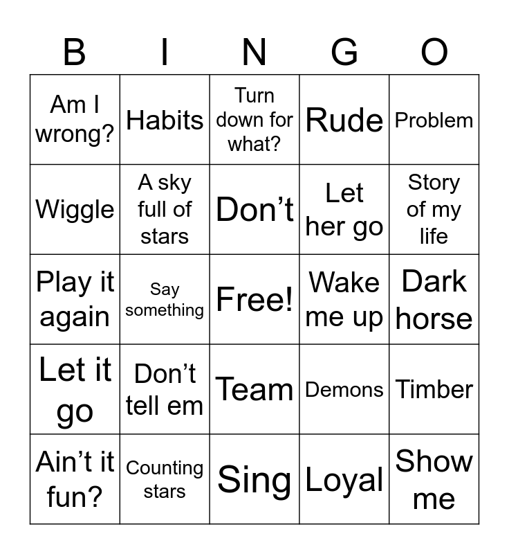 This bingo card has a free space and 69 words: Happy, Dark horse, All of me, Fancy, Counting stars, Talk dirty, Rude, All about that bass, Problem, Stay with me, Timber, Pompeii, Am I wrong?, Turn down for what?, The monster, Say something, Team, Let her go, Royals, Let it go, Wake me up, Demons, Story of my life, Chandelier, Black widow, Bang bang, Latch, Maps, Loyal, Best day of my life, Habits, Summer, Boom clap, Drunk in love, Anaconda, Break free, Bailando, Burn, Wiggle, Rather be, Don’t tell em, Show me, Wrecking Ball, Not a bad thing, Roar, Ain’t it fun?, The man, This is how we roll, Classic, A sky full of stars, Don’t, Na Na, Hold on we’re going home, Sing, Radioactive, Cool kids, Hey brother, Trumpets, Animals, Play it again, Dirt, Love runs out, Bottoms up, Shower, Me and my broken heart, American kids, Brave, Sweater weather and Leave the night on.