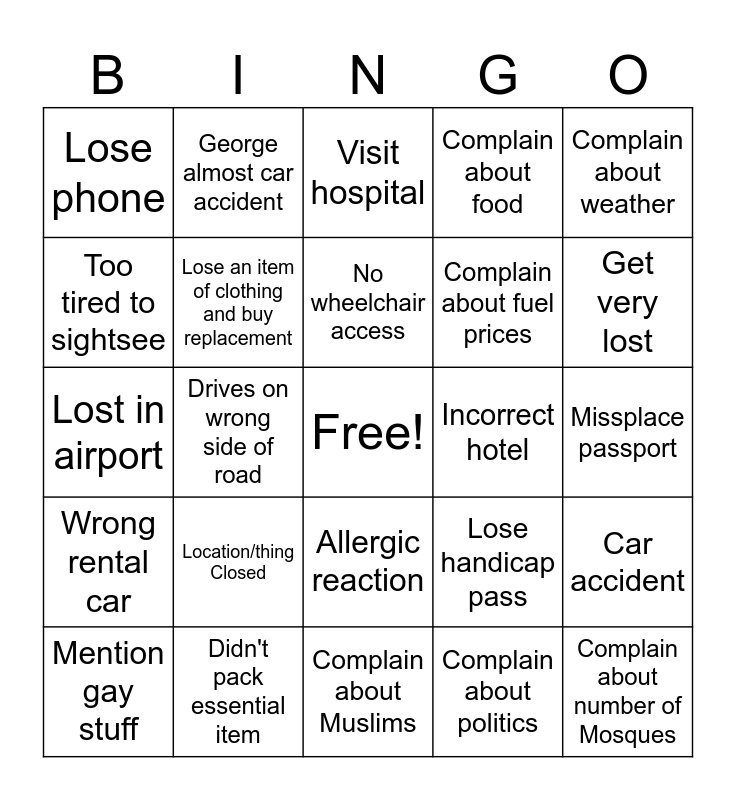 This bingo card has a free space and 24 words: Location/thing Closed, Didn't pack essential item, No wheelchair access, Mention gay stuff, Complain about weather, Lose phone, Too tired to sightsee, George almost car accident, Incorrect hotel, Allergic reaction, Complain about fuel prices, Lost in airport, Lose handicap pass, Car accident, Lose an item of clothing and buy replacement, Complain about politics, Missplace passport, Visit hospital, Get very lost, Drives on wrong side of road, Complain about number of Mosques, Wrong rental car, Complain about food and Complain about Muslims.