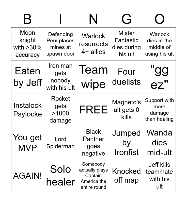 This bingo card has a free space and 24 words: Lord Spiderman, Solo healer, Team wipe, AGAIN!, Warlock dies in the middle of using his ult, Moon knight with >30% accuracy, Eaten by Jeff, Defending Peni places mines at spawn door, Magneto's ult gets 0 kills, Black Panther goes negative, Four duelists, Instalock Psylocke, Jumped by Ironfist, Wanda dies mid-ult, Iron man gets nobody with his ult, Knocked off map, Support with more damage than healing, Warlock resurrects 4+ allies, "gg ez", Rocket gets >1000 damage, Jeff kills teammate with his ult, You get MVP, Mister Fantastic dies during his ult and Somebody actually plays Captain America the entire round.