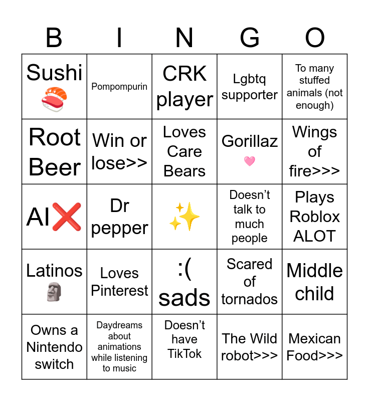 This bingo card has a free space and 24 words: Loves Pinterest, Daydreams about animations while listening to music, Loves Care Bears, Owns a Nintendo switch, To many stuffed animals (not enough), Sushi 🍣, Root Beer, Pompompurin, Doesn’t talk to much people, :( sads, Gorillaz🩷, AI❌, Scared of tornados, Middle child, Win or lose>>, The Wild robot>>>, Plays Roblox ALOT, CRK player, Wings of fire>>>, Dr pepper, Mexican Food>>>, Latinos 🗿, Lgbtq supporter and Doesn’t have TikTok.