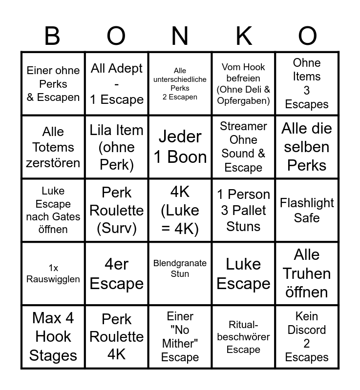 This bingo card has 25 words: 4er Escape, Einer "No Mither" Escape, Jeder 1 Boon, Max 4 Hook Stages, Ohne Items 3 Escapes, Einer ohne Perks & Escapen, Alle Totems zerstören, All Adept - 1 Escape, 1 Person 3 Pallet Stuns, Blendgranate Stun, Streamer Ohne Sound & Escape, Luke Escape nach Gates öffnen, Luke Escape, Alle Truhen öffnen, Lila Item (ohne Perk), Kein Discord 2 Escapes, Flashlight Safe, Alle unterschiedliche Perks 2 Escapen, Alle die selben Perks, Perk Roulette (Surv), 4K (Luke = 4K), Perk Roulette 4K, 1x Rauswigglen, Vom Hook befreien (Ohne Deli & Opfergaben) and Ritual-beschwörer Escape.