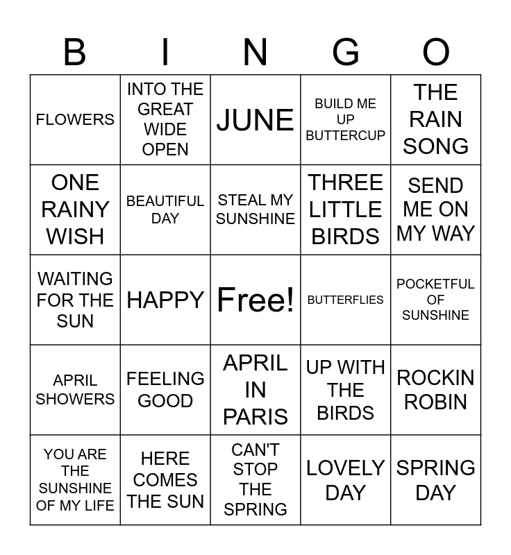 This bingo card has a free space and 30 words: HERE COMES THE SUN, MR BLUE SKY, HAPPY, IT'S GONNA BE ME, FLOWERS, JUNE, BEAUTIFUL DAY, APRIL IN PARIS, BUTTERFLIES, CAN'T STOP THE SPRING, POCKETFUL OF SUNSHINE, SPRING DAY, LOVELY DAY, SUNDAY BEST, SEND ME ON MY WAY, I CAN SEE CLEARLY NOW, UP WITH THE BIRDS, APRIL SHOWERS, FEELING GOOD, THE RAIN SONG, WAITING FOR THE SUN, WHO LOVES THE SUN, INTO THE GREAT WIDE OPEN, THREE LITTLE BIRDS, ONE RAINY WISH, BUILD ME UP BUTTERCUP, ROCKIN ROBIN, YOU ARE THE SUNSHINE OF MY LIFE, STEAL MY SUNSHINE and ZIP-A-DEE-DOO-DAH.