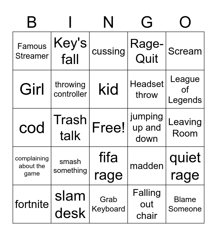 This bingo card has a free space and 24 words: smash something, slam desk, kid, fortnite, Scream, Famous Streamer, Girl, Key's fall, jumping up and down, fifa rage, Headset throw, cod, madden, quiet rage, throwing controller, Falling out chair, Leaving Room, cussing, League of Legends, Trash talk, Blame Someone, complaining about the game, Rage-Quit and Grab Keyboard.