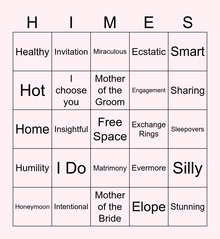 This bingo card has a free space and 49 words: Honey, In Love, Marriage, Elope, Sleepovers, Happy, Invitation, Meaning, Engagement, Spouse, Hot, Insightful, Evermore, Stunning, Hitched, Integrity, Miraculous, Exchange Rings, Save the Date, Healthy, Intentional, Mother of the Bride, Ecstatic, Smart, Handsome, I Do, Mother of the Groom, Endearing, Silly, Humility, Infatuation, Matrimony, Excitement, Submit, Honeymoon, In-Laws, Maid of Honor, Elegant, Sharing, Husband, Intelligence, Minister, Exchange Vows, Something Blue, Home, I choose you, Mr. & Mrs., Emotional and Speeches.