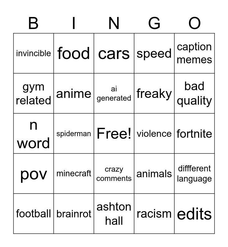 This bingo card has a free space and 24 words: minecraft, brainrot, ai generated, football, caption memes, invincible, gym related, food, violence, crazy comments, freaky, n word, animals, diffferent language, anime, racism, fortnite, cars, bad quality, spiderman, edits, pov, speed and ashton hall.