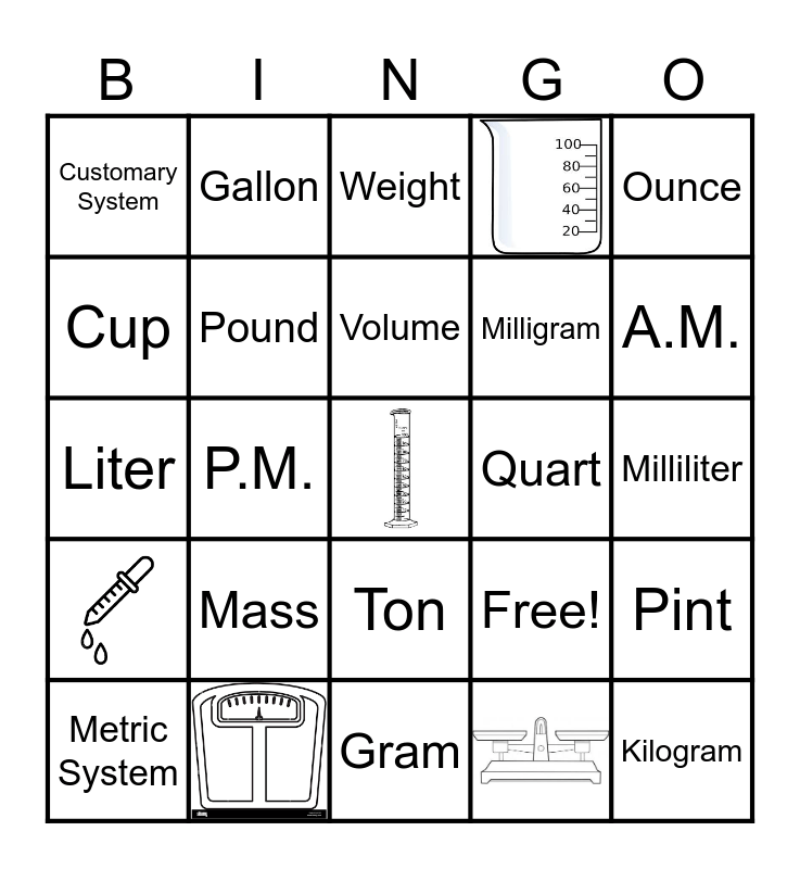 This bingo card has 5 images and 20 words: Mass, Gram, Volume, Metric System, Ounce, Customary System, Cup, Gallon, Quart, Ton, Milligram, Liter, Free!, Pint, Pound, Kilogram, Milliliter, Weight, A.M. and P.M..