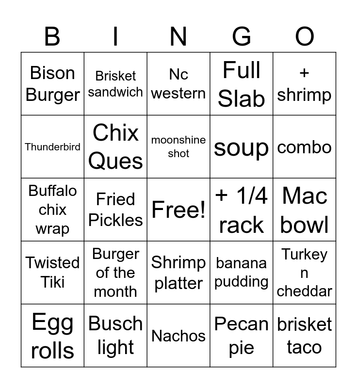 This bingo card has a free space and 29 words: Egg rolls, Beer of the month, Fried Pickles, Smokehouse dip, Bison Burger, Nc western, Chix Ques, Burger of the month, + 1/4 rack, Busch light, Mac bowl, brisket taco, Nachos, Pecan pie, combo, easy breezy, Shrimp platter, Twisted Tiki, + shrimp, Buffalo chix wrap, banana pudding, shrimp taco, soup, Thunderbird, Full Slab, Brisket sandwich, Turkey n cheddar, moonshine shot and Shrimp Skewer.