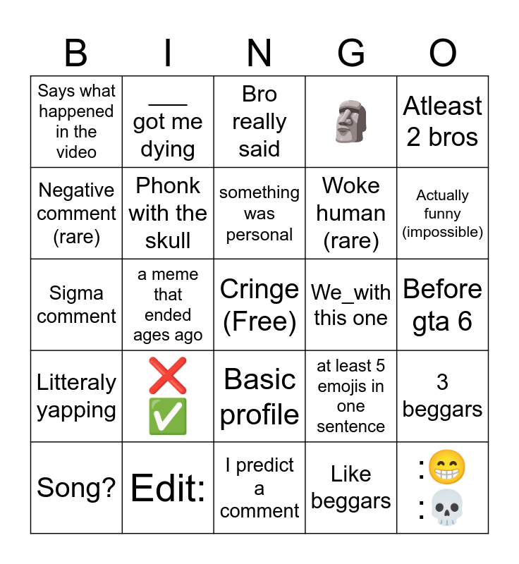 This bingo card has a free space and 24 words: ❌ ✅, Edit:, something was personal, Song?, Atleast 2 bros, Says what happened in the video, Negative comment (rare), ___ got me dying, We_with this one, Basic profile, Woke human (rare), Sigma comment, at least 5 emojis in one sentence, 3 beggars, Phonk with the skull, Like beggars, Before gta 6, Bro really said, Actually funny (impossible), a meme that ended ages ago, :😁 :💀, Litteraly yapping, 🗿 and I predict a comment.