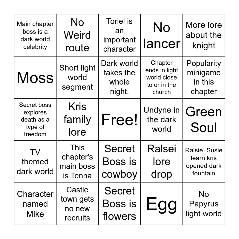 This bingo card has a free space and 24 words: This chapter's main boss is Tenna, Castle town gets no new recruits, Dark world takes the whole night., Character named Mike, More lore about the knight, Main chapter boss is a dark world celebrity, Moss, No Weird route, Undyne in the dark world, Secret Boss is cowboy, Chapter ends in light world close to or in the church, Secret boss explores death as a type of freedom, Ralsei lore drop, Ralsie, Susie learn kris opened dark fountain, Short light world segment, Egg, Green Soul, Toriel is an important character, Popularity minigame in this chapter, Kris family lore, No Papyrus light world, TV themed dark world, No lancer and Secret Boss is flowers.
