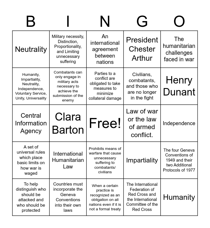 This bingo card has a free space and 28 words: The four Geneva Conventions of 1949 and their two Additional Protocols of 1977, To educate the public about International Humanitarian Law, Civilians, combatants, and those who are no longer in the fight, The International Federation of Red Cross and the International Committee of the Red Cross, Humanity, Impartiality, Neutrality, Independence, Voluntary Service, Unity, Universality, An international agreement between nations, Military necessity, Distinction, Proportionality, and Limiting unnecessary suffering, A set of universal rules which place basic limits on how war is waged, Law of war or the law of armed conflict., To help distinguish who should be attacked and who should be protected, Central Information Agency, President Chester Arthur, Countries must incorporate the Geneva Conventions into their own laws, When a certain practice is recognized as an obligation on all nations even if it is not a formal treaty, Henry Dunant, By taking feasible precautions, International Humanitarian Law, Combatants can only engage in military acts necessary to achieve the submission of the enemy, Parties to a conflict are obligated to take measures to minimize collateral damage, Prohibits means of warfare that cause unnecessary suffering to combatants/ civilians, Neutrality, To prevent and alleviate human suffering in the face of emergencies, Humanity, Clara Barton, Independence, Impartiality, The humanitarian challenges faced in war and Universality.