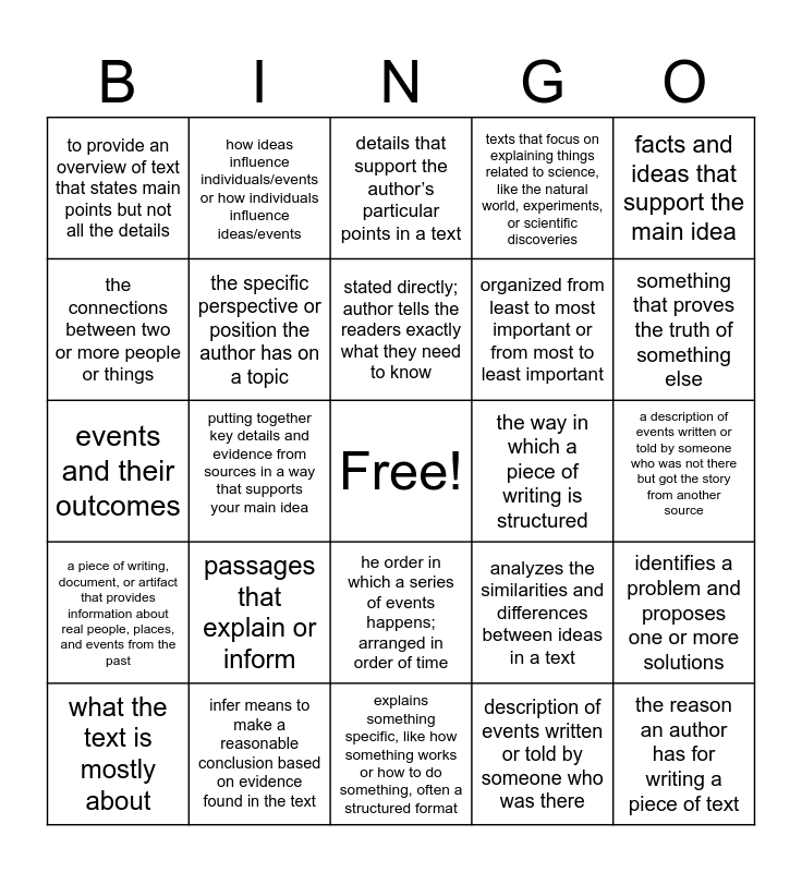 This bingo card has a free space and 24 words: passages that explain or inform, infer means to make a reasonable conclusion based on evidence found in the text, stated directly; author tells the readers exactly what they need to know, what the text is mostly about, facts and ideas that support the main idea, to provide an overview of text that states main points but not all the details, the connections between two or more people or things, how ideas influence individuals/events or how individuals influence ideas/events, the way in which a piece of writing is structured, he order in which a series of events happens; arranged in order of time, organized from least to most important or from most to least important, events and their outcomes, analyzes the similarities and differences between ideas in a text, identifies a problem and proposes one or more solutions, the specific perspective or position the author has on a topic, description of events written or told by someone who was there, a description of events written or told by someone who was not there but got the story from another source, details that support the author’s particular points in a text, something that proves the truth of something else, putting together key details and evidence from sources in a way that supports your main idea, the reason an author has for writing a piece of text, a piece of writing, document, or artifact that provides information about real people, places, and events from the past, texts that focus on explaining things related to science, like the natural world, experiments, or scientific discoveries and explains something specific, like how something works or how to do something, often a structured format.