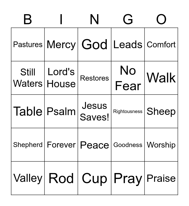 This bingo card has a free space and 24 words: Forever, Rod, Restores, Valley, Comfort, Pastures, Still Waters, Mercy, Rightousness, Peace, No Fear, Table, Goodness, Worship, Lord's House, Pray, Sheep, God, Walk, Psalm, Praise, Shepherd, Leads and Cup.
