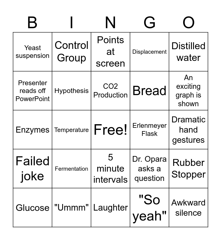 This bingo card has a free space and 24 words: Fermentation, "Ummm", CO2 Production, Glucose, Distilled water, Yeast suspension, Presenter reads off PowerPoint, Control Group, Erlenmeyer Flask, 5 minute intervals, Bread, Enzymes, Dr. Opara asks a question, Rubber Stopper, Hypothesis, "So yeah", Dramatic hand gestures, Points at screen, An exciting graph is shown, Temperature, Awkward silence, Failed joke, Displacement and Laughter.