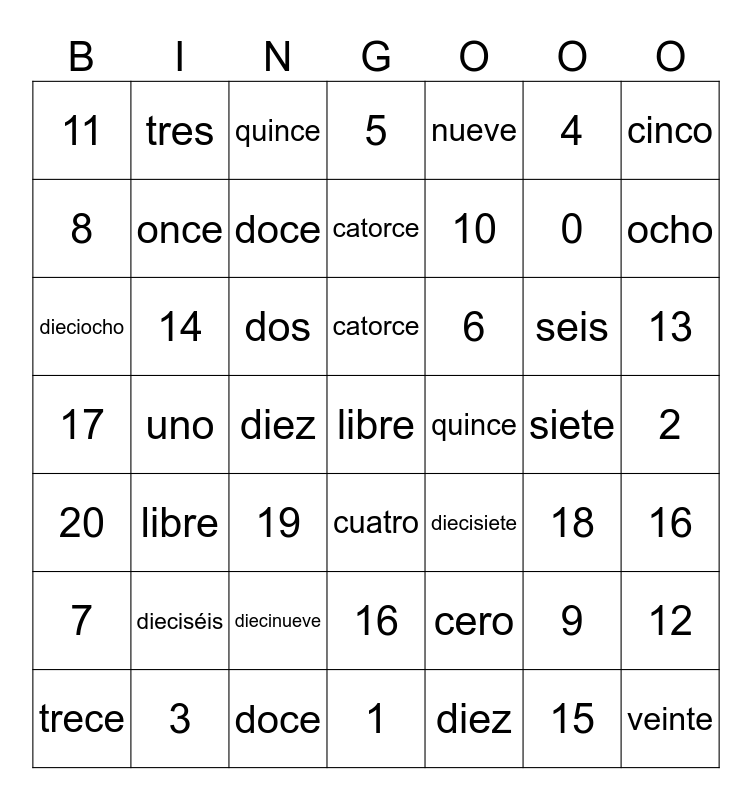 This bingo card has a free space and 48 words: cero, 0, 1, uno, dos, 2, tres, 3, 4, cuatro, cinco, 5, seis, 6, 7, siete, 8, ocho, 9, nueve, 10, diez, 11, once, 12, doce, 13, trece, catorce, 14, 15, quince, 16, dieciséis, 17, diecisiete, 18, dieciocho, 19, diecinueve, 20, veinte, quince, doce, catorce, 16, libre and diez.