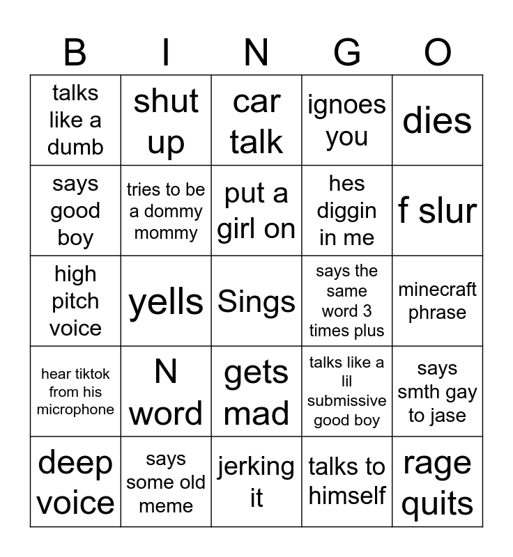 This bingo card has a free space and 24 words: N word, says some old meme, put a girl on, deep voice, dies, talks like a dumb, says good boy, shut up, says the same word 3 times plus, gets mad, hes diggin in me, high pitch voice, talks like a lil submissive good boy, says smth gay to jase, tries to be a dommy mommy, talks to himself, minecraft phrase, car talk, f slur, yells, rage quits, hear tiktok from his microphone, ignoes you and jerking it.