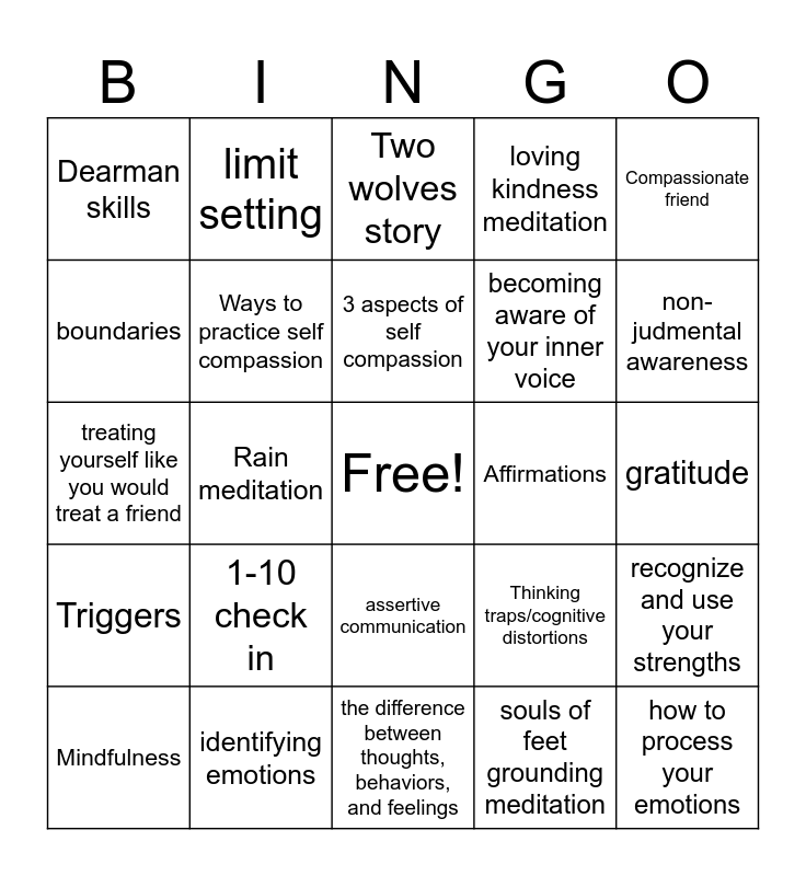 This bingo card has a free space and 24 words: 1-10 check in, identifying emotions, 3 aspects of self compassion, Mindfulness, Compassionate friend, Dearman skills, boundaries, limit setting, Affirmations, assertive communication, becoming aware of your inner voice, treating yourself like you would treat a friend, Thinking traps/cognitive distortions, recognize and use your strengths, Ways to practice self compassion, souls of feet grounding meditation, gratitude, Two wolves story, non-judmental awareness, Rain meditation, how to process your emotions, Triggers, loving kindness meditation and the difference between thoughts, behaviors, and feelings.