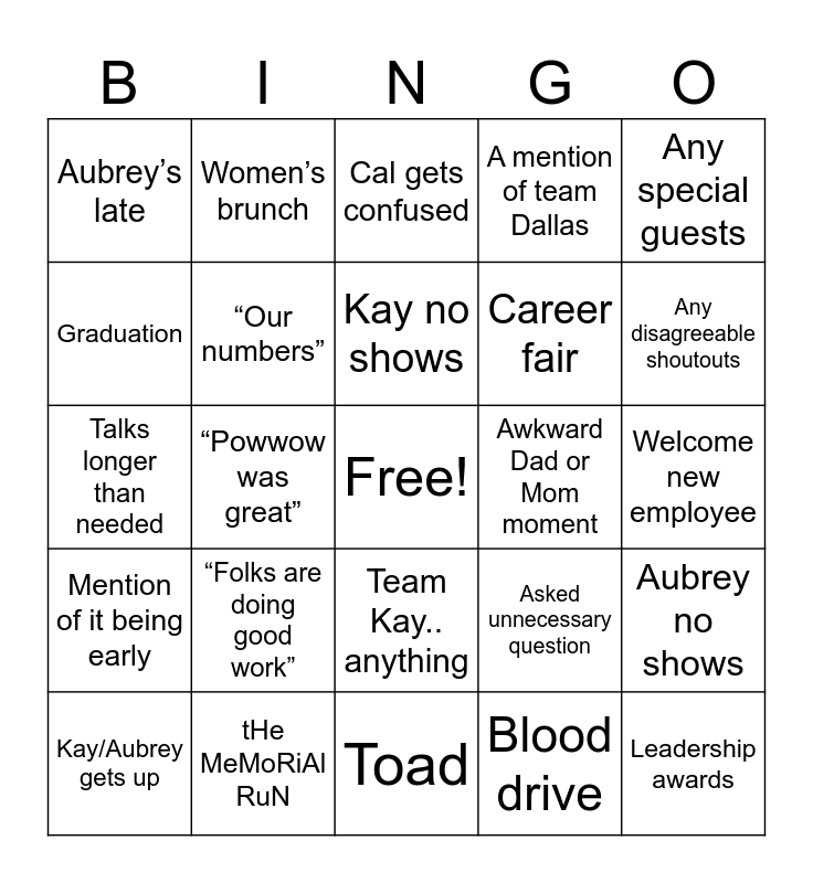 This bingo card has a free space and 29 words: Kay/Aubrey gets up, Cole dad joke, “Powwow was great”, Tech fail, Aubrey’s late, Cal gets confused, “Our numbers”, “Folks are doing good work”, Awkward Dad or Mom moment, tHe MeMoRiAl RuN, Welcome new employee, Leadership awards, Toad, Blood drive, Any disagreeable shoutouts, “Had to have my coffee”, Team Kay.. anything, Mention of it being early, Any special guests, Talks longer than needed, Asked unnecessary question, NBO, Career fair, Graduation, A mention of team Dallas, Women’s brunch, Aubrey no shows, Kay no shows and Cal leaves early.