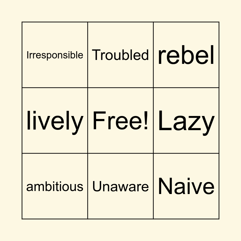 This bingo card has a free space and 8 words: lively, Troubled, Lazy, ambitious, rebel, Irresponsible, Unaware and Naive.