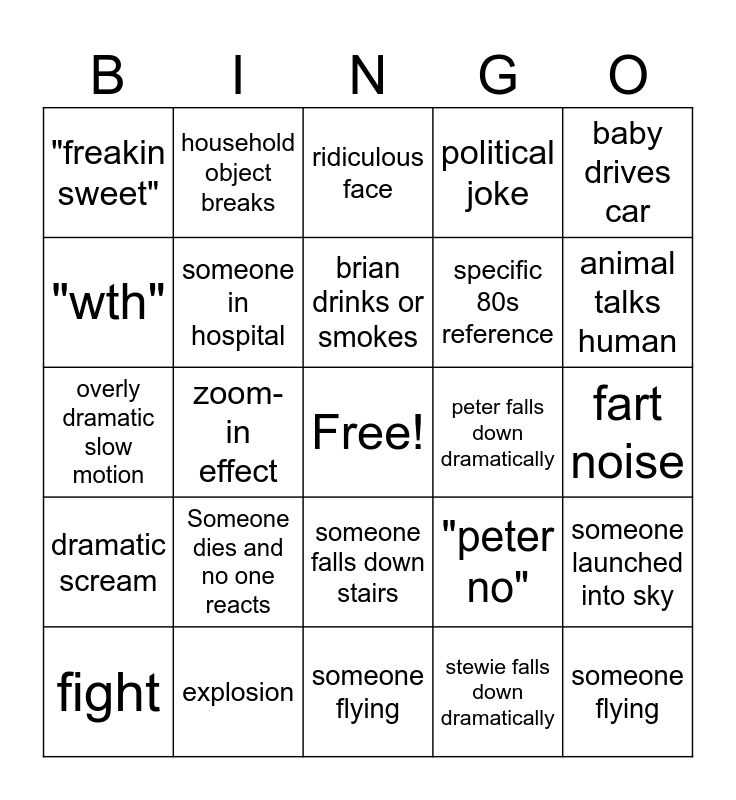 This bingo card has a free space and 24 words: Someone dies and no one reacts, explosion, brian drinks or smokes, fight, baby drives car, "freakin sweet", "wth", household object breaks, peter falls down dramatically, someone falls down stairs, specific 80s reference, overly dramatic slow motion, "peter no", someone launched into sky, someone in hospital, stewie falls down dramatically, fart noise, ridiculous face, animal talks human, zoom-in effect, someone flying, dramatic scream, political joke and someone flying.