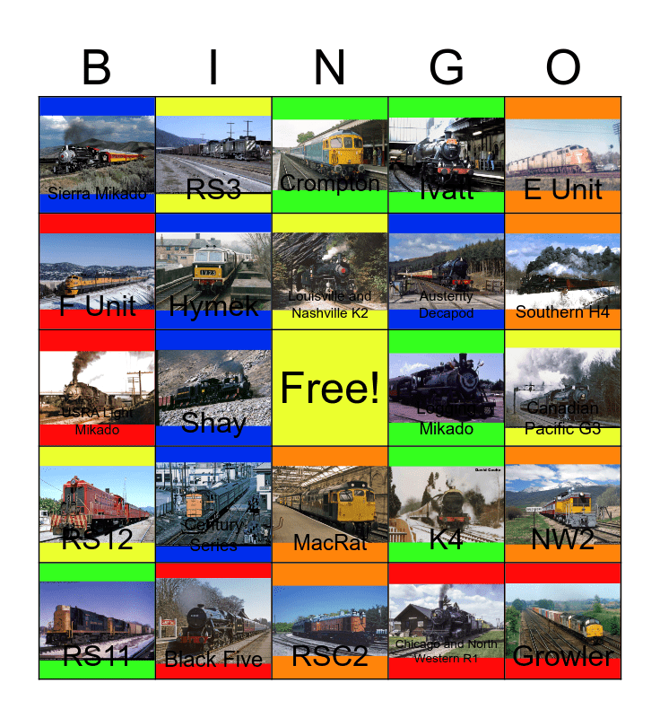 This bingo card has 24 images, a free space and 24 words: Century Series, Black Five, Louisville and Nashville K2, RS11, E Unit, Sierra Mikado, F Unit, RS3, Logging Mikado, MacRat, Austerity Decapod, USRA Light Mikado, K4, NW2, Hymek, Chicago and North Western R1, Canadian Pacific G3, Crompton, Southern H4, Shay, Growler, RS12, Ivatt and RSC2.