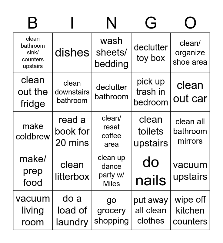 This bingo card has a free space and 24 words: clean litterbox, do a load of laundry, declutter bathroom, vacuum living room, clean/ organize shoe area, clean bathroom sink/ counters upstairs, clean out the fridge, dishes, clean toilets upstairs, clean up dance party w/ Miles, pick up trash in bedroom, make coldbrew, do nails, vacuum upstairs, clean downstairs bathroom, put away all clean clothes, clean all bathroom mirrors, wash sheets/ bedding, clean out car, read a book for 20 mins, wipe off kitchen counters, make/ prep food, declutter toy box and go grocery shopping.