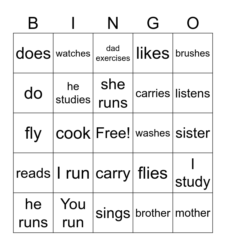 This bingo card has a free space and 24 words: I run, You run, she runs, he runs, brushes, does, do, watches, washes, carry, carries, fly, flies, I study, he studies, brother, sister, dad exercises, listens, cook, mother, reads, likes and sings.