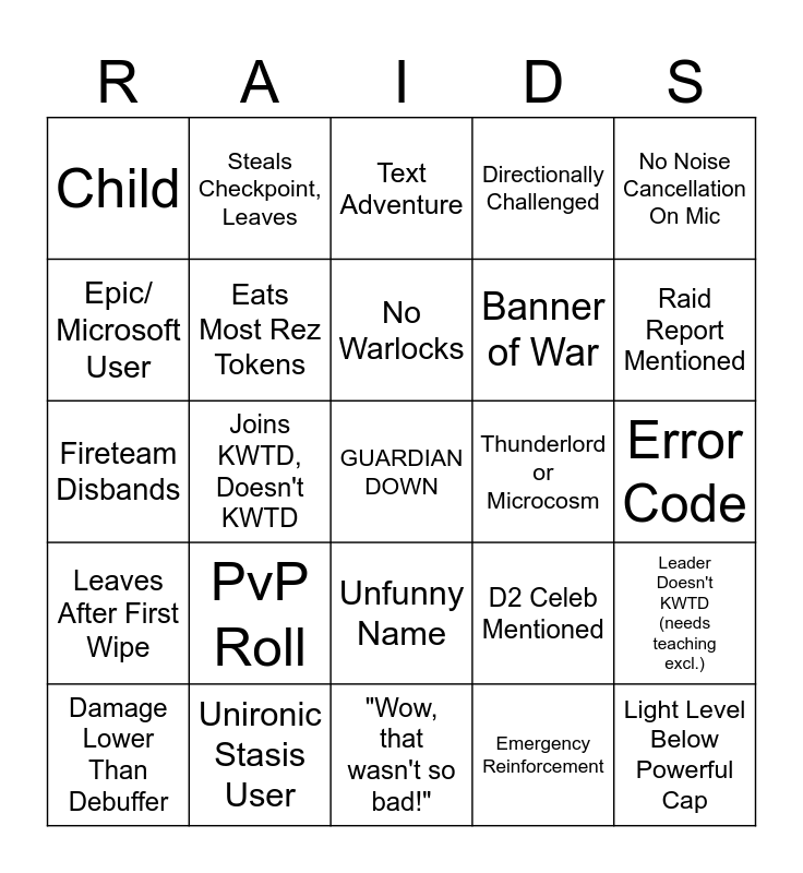 This bingo card has a free space and 97 words: Double Primary, Silent Leaver, "I'm a little rusty on this part...", Joins KWTD, Doesn't KWTD, Over-Enthusiastic Sherpa, "There goes flawless!!!!", ENRAGE IS NEAR, Targeting Adjuster, Intoxicated Guardian, Multiple Raid Banners, Yapping, "I'll do ad clear.", Name (Adept), Leaves After First Wipe, D1 Mentioned, Child, No Noise Cancellation On Mic, Displaced Raid Banner, IRL Lore Dumping, Specific Loadout Requirement, Loot Complaints, Micless and Bad, Strafing in Well, Dies to Own Explosion, Sherpa Doesn't Teach, No Warlocks, Damage Lower Than Debuffer, Leader Doesn't KWTD (needs teaching excl.), "Why did we wipe?", Meme Weapon Glazing, Eats Most Rez Tokens, Directionally Challenged, Speedrunner Detected, No Orbs/Ammo Scout, "Wow, that wasn't so bad!", Unfunny Name, Glaive, Raid Exotic Drop, 8x+ Gilded Title, Fireteam Disbands, Roaming Super On Boss, Error Code, Does Cheese, Emergency Reinforcement, PvP Roll, No Exotic Armor, Off-Meta Crafted Roll, Failed Skate, Guardian Rank Mentioned, Bad Callout, *munch* *crunch* *slurp* *smack*, 3 Hours Or More, Raid Mods, Dawning Weapon, Abandons Role, Gambit Mentioned, Raid Banner Placed Early, Steals Checkpoint, Leaves, Trials Armor, 10k+ Kills On Tracker, Divinity, Random Shaders On Armor, Eververse Whale, Lumina, Anti-Barrier Exotic, Starfire Protocol, Trace Rifle, D2 Y1 DPS, Insane Boss Damage, Unironic Stasis User, Banner of War, PvP Exotic, Dredgen, "I have x clears...", Day One Mentioned, Surge Mods Don't Match, Meme Title, "Better" Strat Suggested, Thunderlord or Microcosm, [CLASS ITEM] of Contests, Basic/Progression Emblem, Raid Report Mentioned, Godslayer, Actually Funny Name, Sparrow in Current Year, Amateur Comedian, Light Level Below Powerful Cap, New Light, Mysterious Exotic Class Item, Emote Spammer, Text Adventure, Font of <Stat>, 2+ Clan Members, D2 Celeb Mentioned, Epic/ Microsoft User, Actual Argument and Guardian was kicked from the Fireteam.