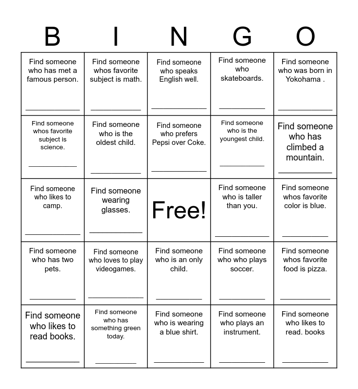 This bingo card has a free space and 34 words: Find someone who wears glasses. ______________, Find someone who plays an instrument. ___________, Find someone who is left handed. ___________, Find someone whos name starts with the same letter as yours. ______________, Find someone who has two pets. ___________, Find someone who is the oldest child. ____________, Find someone who was born in Yokohama . _____________, Find someone who likes to read books. ___________, Find someone whos favorite subject is math. ____________, Find someone who enjoys cooking. ___________, Find someone who prefers Pepsi over Coke. ______________, Find someone who speaks English well. ______________, Find someone who can draw. __________, Find someone who was born in the same month as you. ______________, Find someone who is taller than you. _____________, Find someone who has climbed a mountain. ___________, Find someone who has something green today. ___________, Find someone who likes to camp. ______________, Find someone who loves to play videogames. ______________, Find someone who who plays soccer. ___________, Find someone who is an only child. ___________, Find someone who can sing well. ___________, Find someone who has met a famous person. _____________, Find someone whos favorite color is blue. ___________, Find someone who is wearing a blue shirt. ____________, Find someone who likes to read. books ___________, Find someone who skateboards. ___________, Find someone who is the middle child. _____________, Find someone who is the youngest child. ____________, Find someone whos favorite subject is science. _____________, Find someone who has no pets. _____________, Find someone wearing glasses. ____________, Find someone whos favorite food is pizza. ____________ and Find someone who is wearing nail polish. ____________.