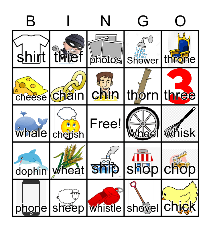 This bingo card has 24 images, a free space and 24 words: wheat, sheep, chin, phone, throne, shirt, cheese, thief, Wheel, ship, thorn, whale, shop, chop, chain, shovel, whisk, photos, three, cherish, chick, dophin, Shower and whistle.